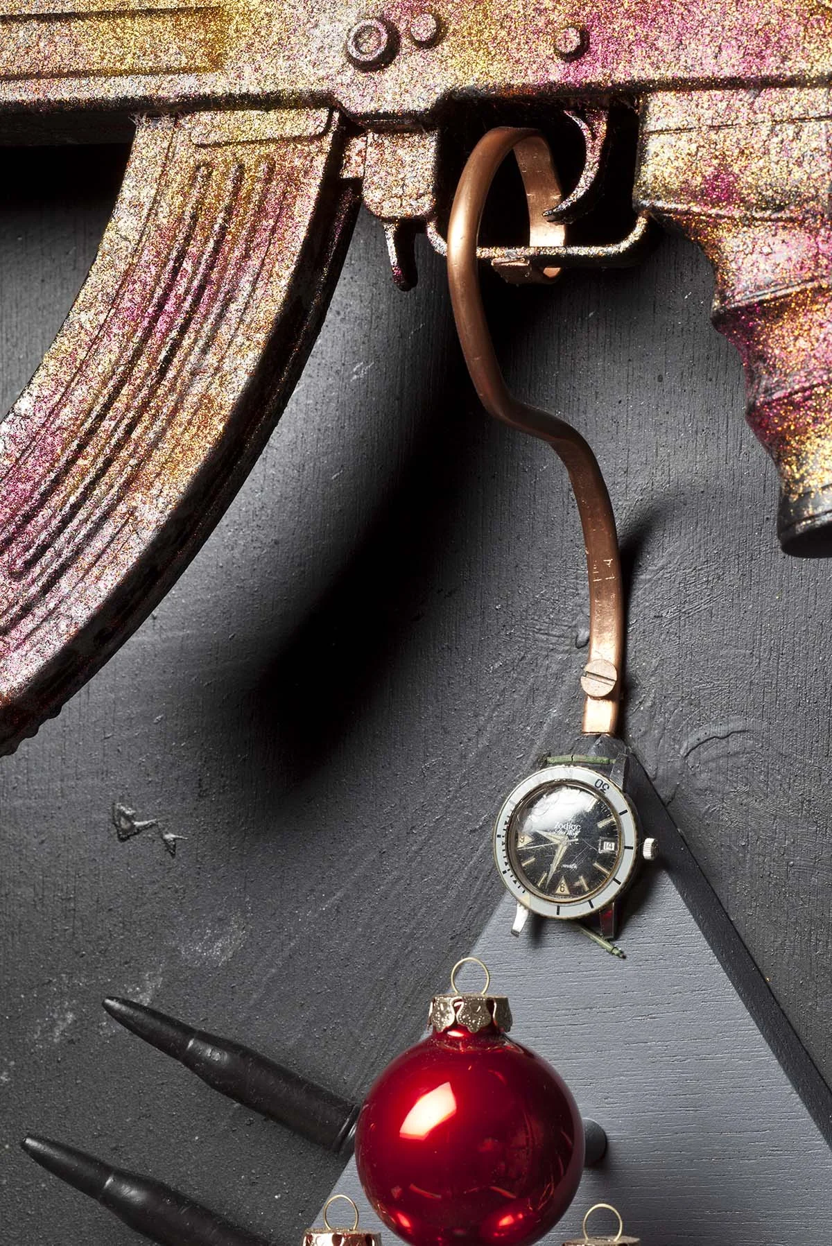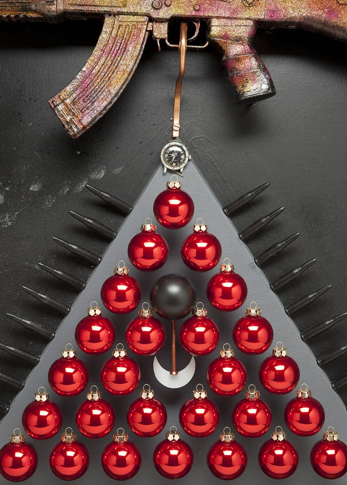 The massacre of December 14, 2012 in Newton CT left 20 children and 6 educators dead, represented here by red Christmas tree balls.